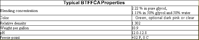 BTFFCA, used as directed, will result in an antifreeze / engine coolant that may be used in virtually any engine cooling system. This technology is well proven over decades of use, and is essentially identical to the coolants used in most North American heavy duty vehicle plants as factory fill. BTFFCA meets ASTM D6210 (type 1 if blended with ethylene glycol, type 2 if blended with propylene glycol, type 3 if blended with 50% EG and water, type 4 if blended with 50%PG and water). It is also approved for blending with 1,3 propanediol (PDO) to make coolant that is more thermally stable than EG or PG coolants. The coolant also meets TMC RP-329 (EG or TMC RP-330 (PG). If used as directed BTFFCA will provide satisfactory performance in most cars and trucks including the following: