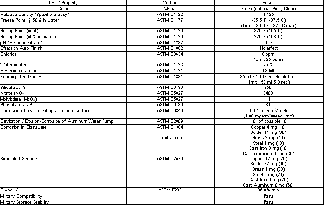 Typical Table of Properties and ASTM Test Results (blended with EG):