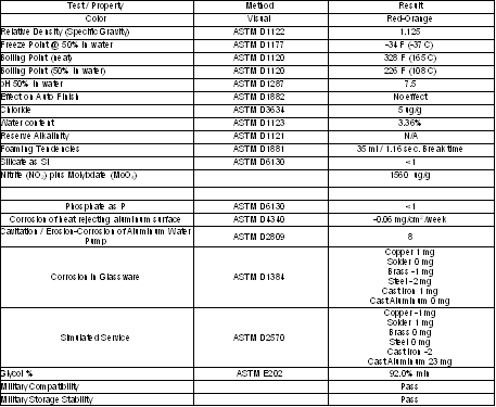 Table of Properties and Typical ASTM Test Results blended with EG as Antifreeze Concentrate: