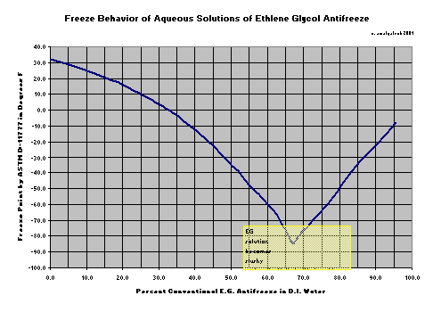 Most engine manufacturers recommend that coolant contain from 40% to 60% antifreeze. The freeze point of pure EG antifreeze, interestingly is about -5 degrees F.